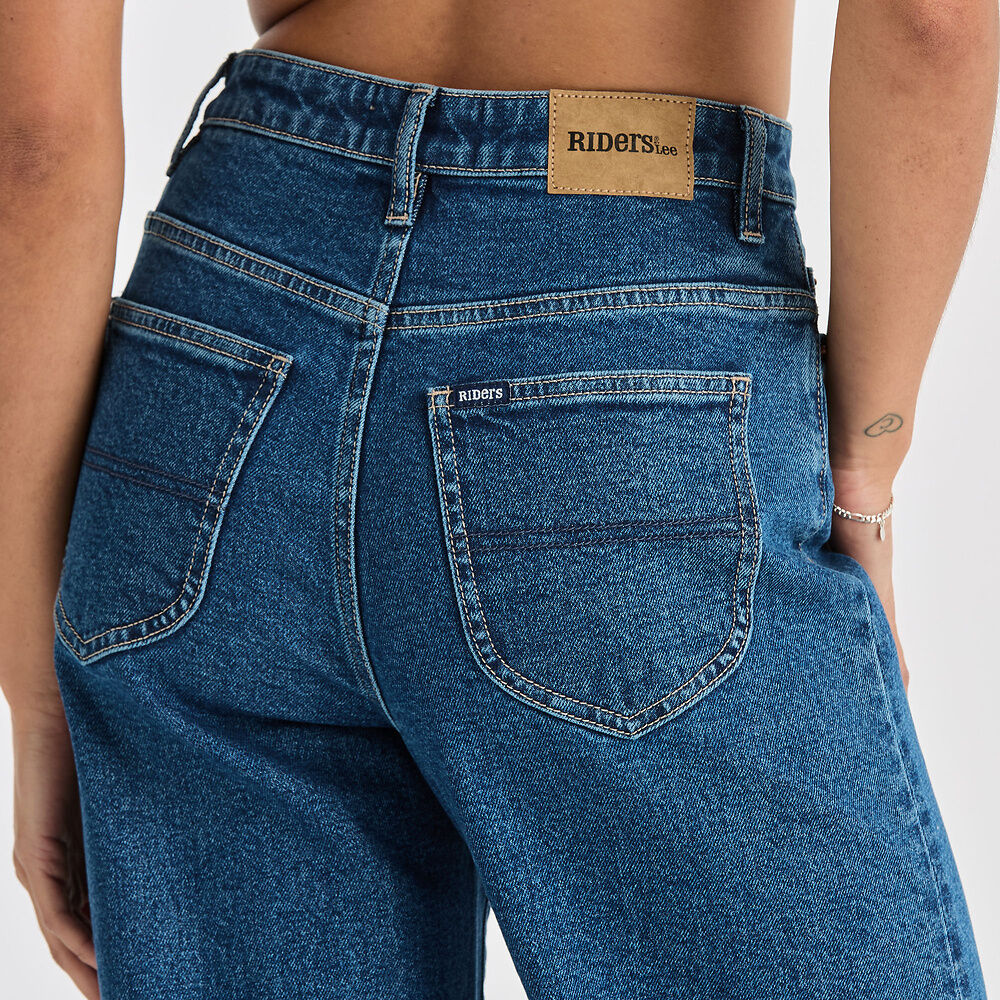 Elevate your style with the RIDERS HI WIDE JEAN AFTERGLOW! This high waist, A-line silhouette flatters and lengthens your legs. Dress up with heels or rock a 90's vibe by stacking over your shoes. Features a zip fly, contrast stitching, and a paper patch for a touch of eco-friendly fashion. Available in petite sizing. Model is 169cm tall and wearing size 8.