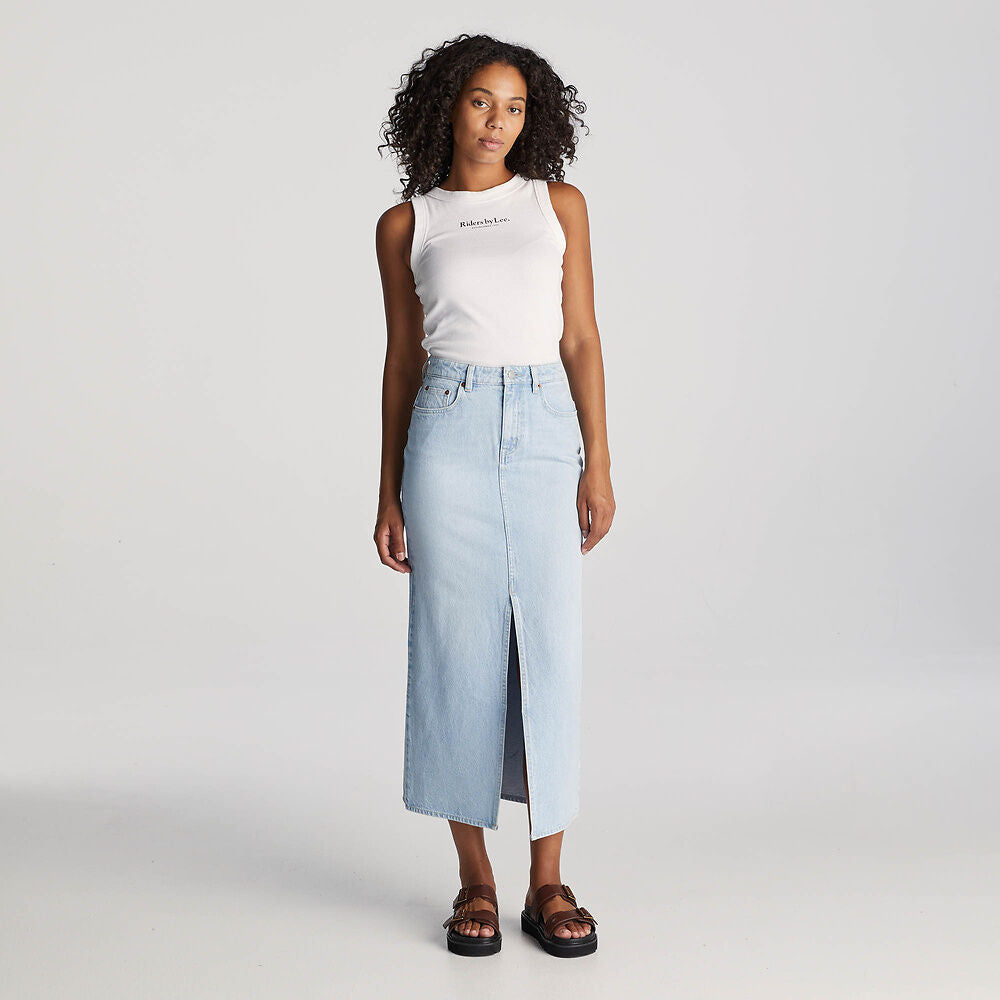 Expertly crafted in soft non-stretch denim, the RIDERS HIGH RISE MAXI SKIRT BREATHLESS BLUE is a timeless wardrobe staple. The high rise and slim top block create a flattering silhouette, while the central split and vintage-inspired details add a touch of elegance. Made with water-saving technology and a vegan paper patch, this ethically-made skirt is sure to become your go-to for any season.