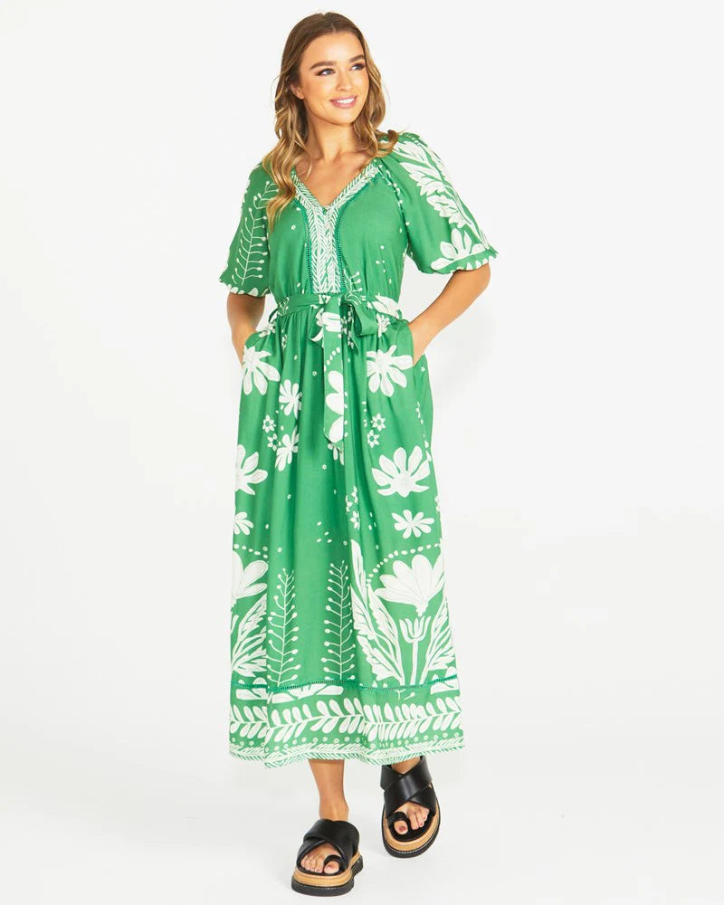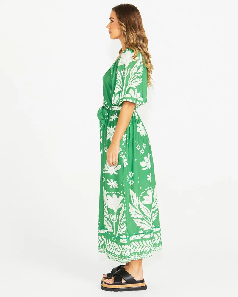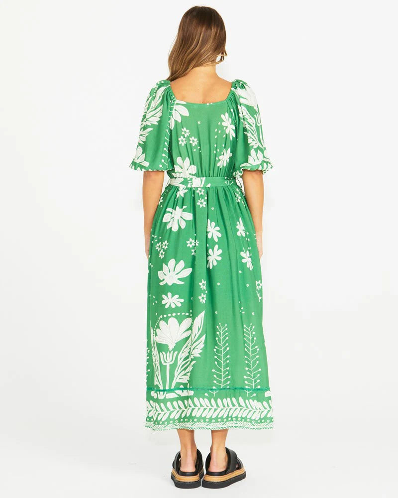 Effortlessly chic and playful, the SASS Lyndel Dress in Green Floral is perfect for any occasion. Its refined silhouette features a midi length, V-neckline, and self-fabric tie belt for a touch of sophistication. The puff sleeves add a fun twist to this relaxed-fit piece, making it a must-have for workdays and weekend gatherings. Made from 100% viscose and easy to care for, this dress will become your go-to for any event.