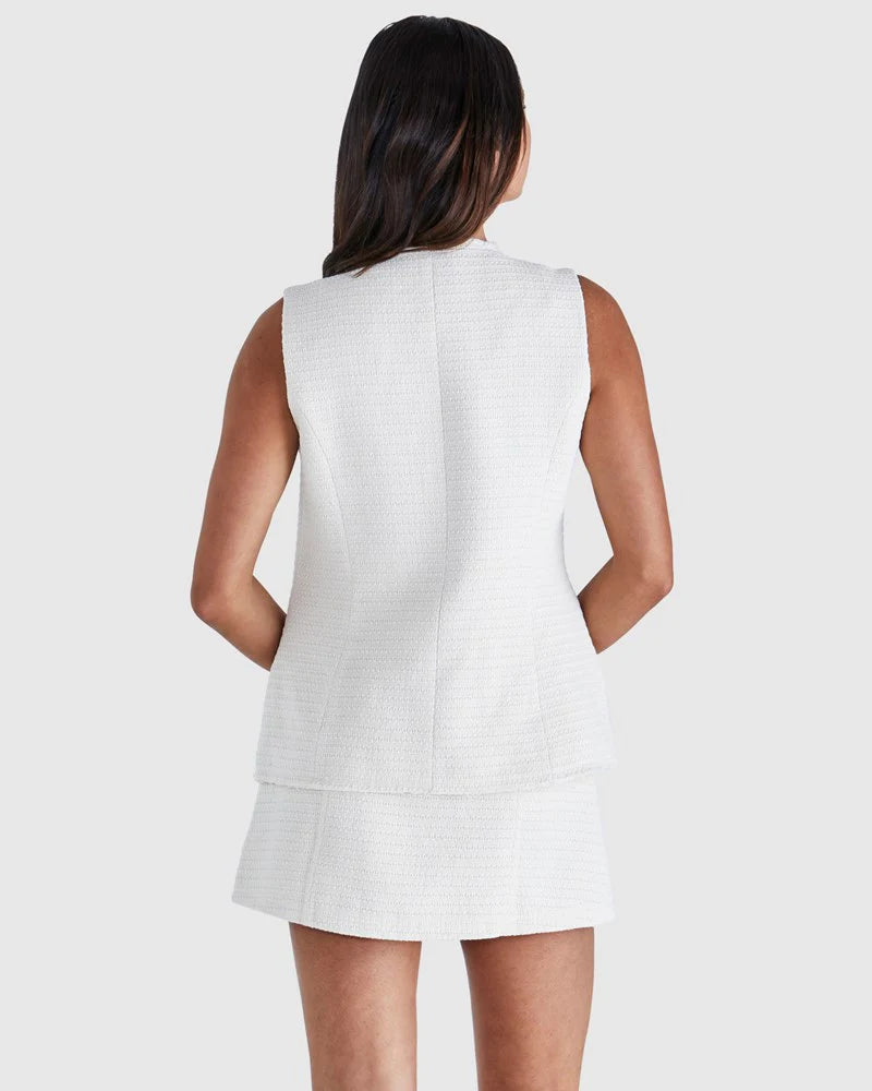 The Sass Nico Vest in cream brings retro-cool style with its scooped neckline and boucle texture. Lined for comfort, it features charming button details and a relaxed fit, making it easy to dress up or down. Made from 100% polyester with a cotton lining, this vest is both stylish and comfortable. Perfect for adding a main-character vibe to any outfit.