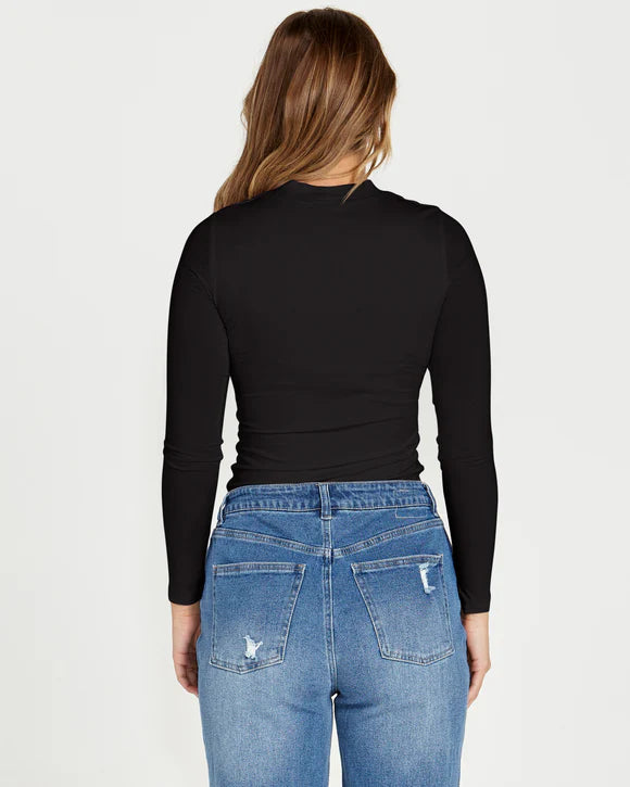 Elevate your wardrobe with the Nisha Mock Neck Top in black. Featuring a sophisticated mock neckline and high hip length, this versatile and trendy long-sleeve top is the perfect addition to any outfit. Made with 95% cotton and 5% elastane, it's both comfortable and easy to care for. A must-have for any fashion-forward individual.
