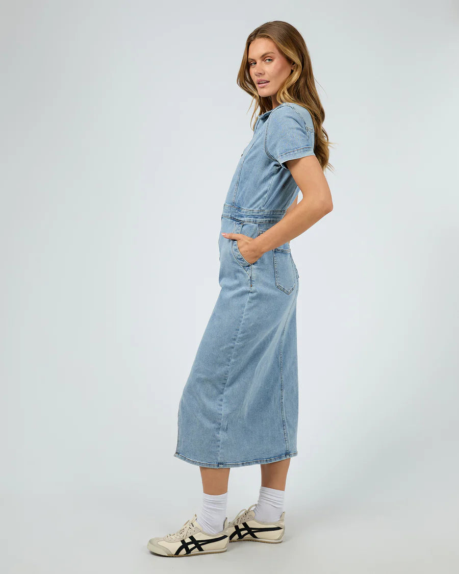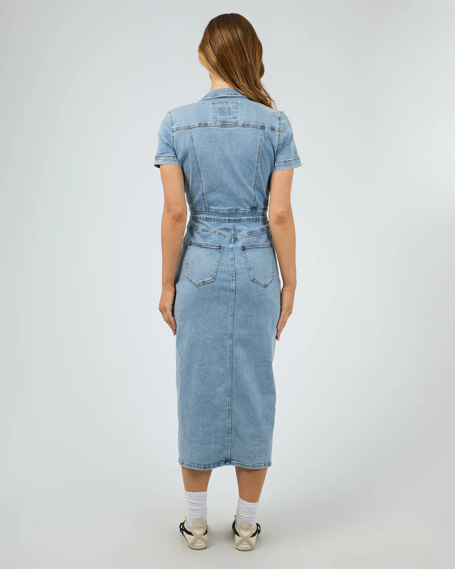 Introducing our best-selling Boston Playsuit's new friend, the Boston Midi Dress in light blue. Crafted from stretch denim with a functional front zip and split, this dress is perfect for on-the-go summer days. Pair with your favorite sandals for an easy look. 98% cotton, 2% elastane. Model wears size 8.