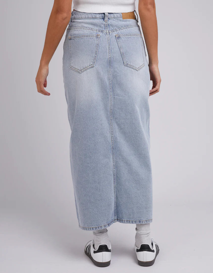 Revamp your denim collection with the SILENT THEORY EVA MAXI SKIRT in light blue. This versatile piece features a front split and maxi length, adding a touch of style to any outfit. Made from 100% cotton, it's also comfortable for all-day wear. Upgrade your style game now!
