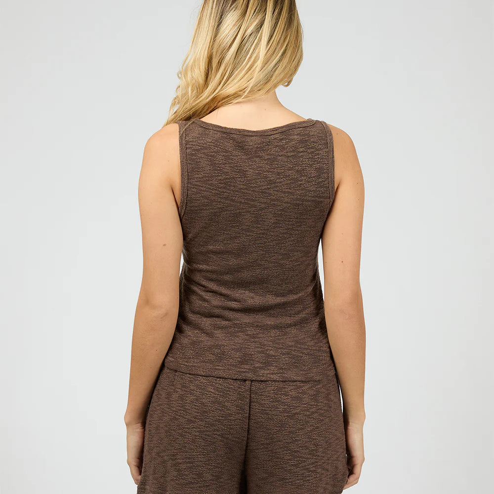 The Silent Theory Leonie Vest in chocolate is crafted from a stretchy, textured knit blend of polyester and elastane for a comfortable fit. It features a button-down front, a fully lined interior, and a flattering V-neckline. A slit at the bottom hem adds both style and ease of movement, making this vest a versatile piece for layering in any wardrobe.