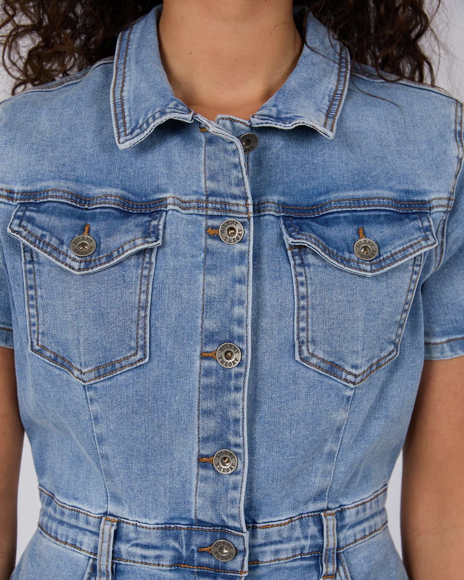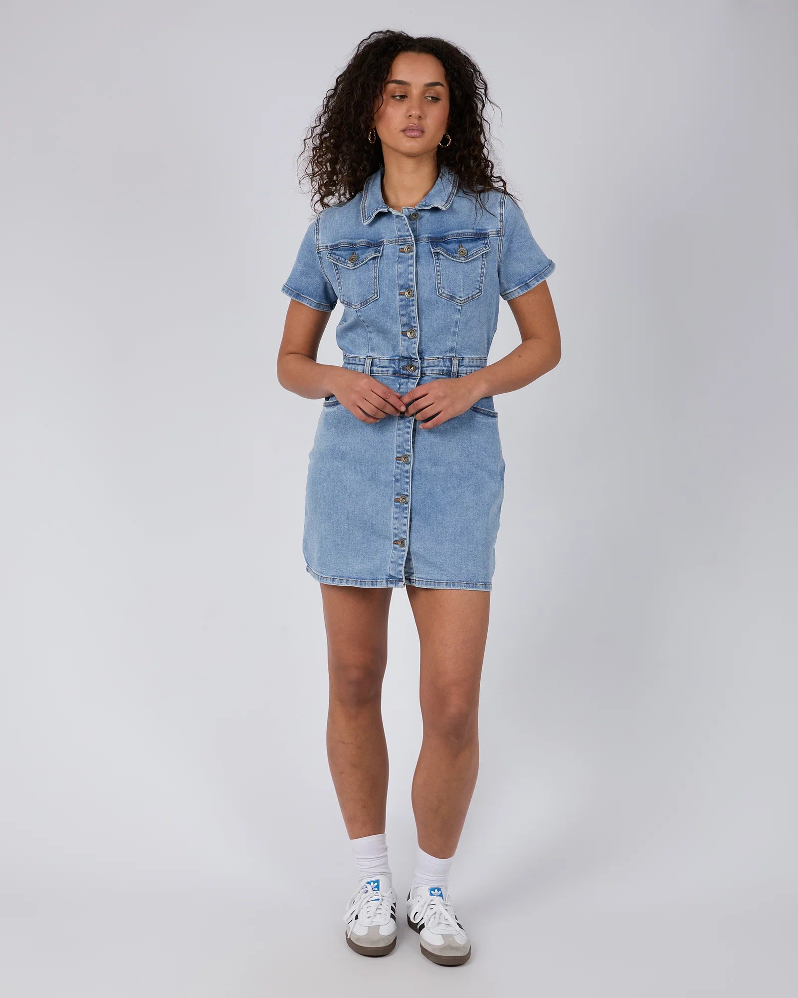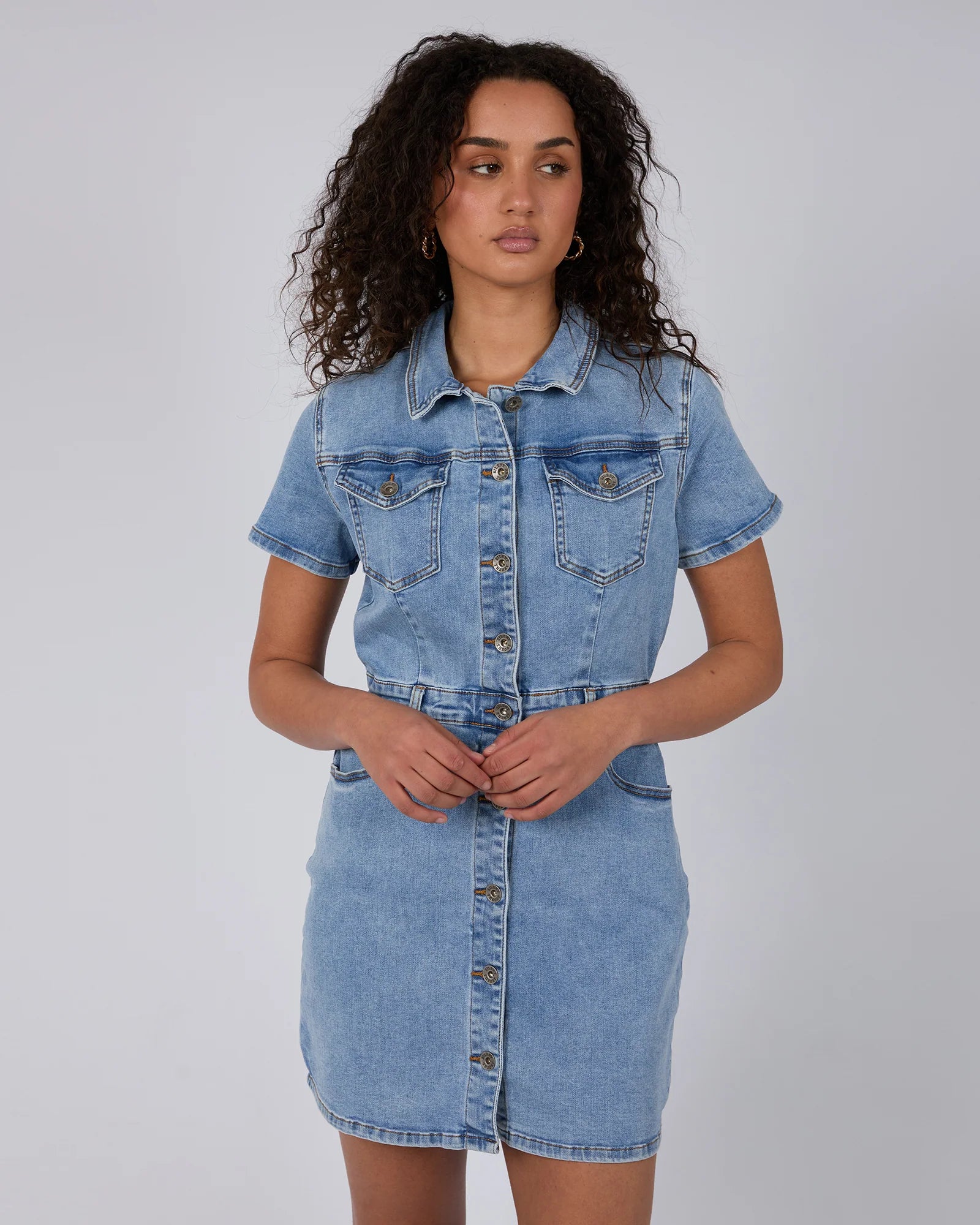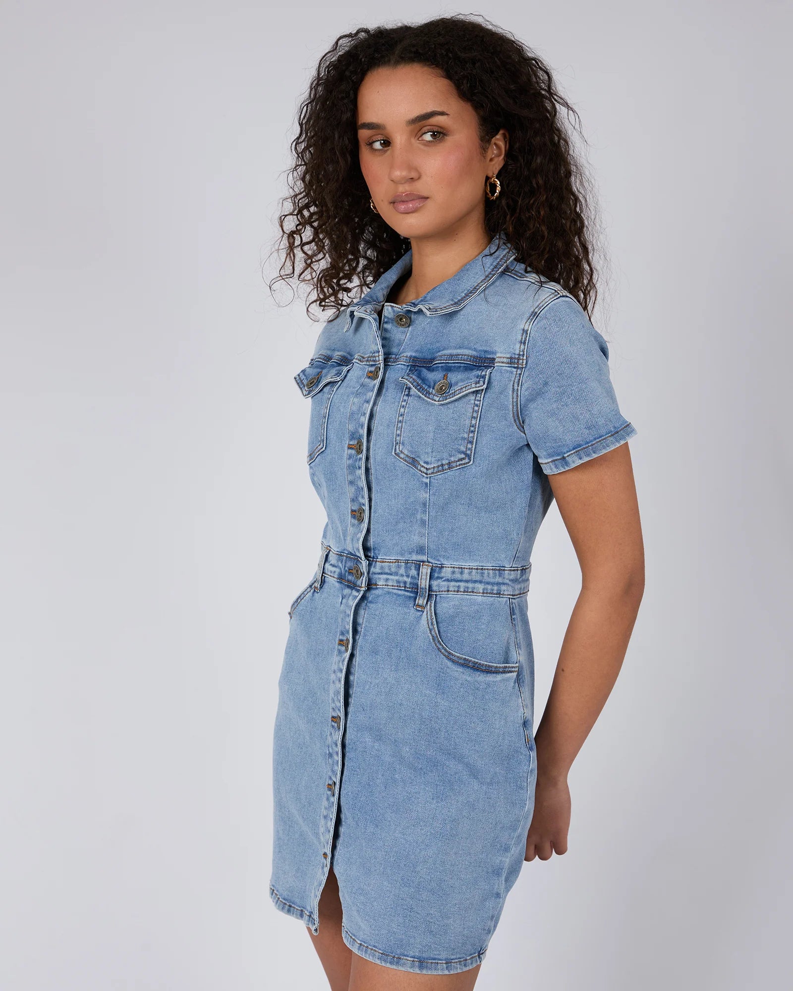 The Shay Mini Dress by Silent Theory is a must-have for everyday wear. The light blue stretch denim offers both comfort and style, while the collared neckline, short sleeves, and functional button-down front add a touch of sophistication. With convenient pockets and a stretchy cotton blend, this mini dress is sure to become a go-to in your wardrobe.Â