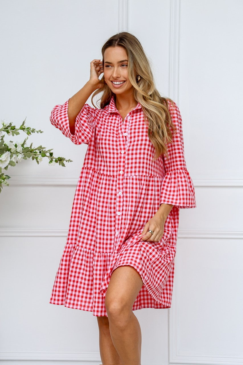 ST GERMAIN TIERED COLLARED KNEE LENGTH DRESS RED/PINK GINGHAM