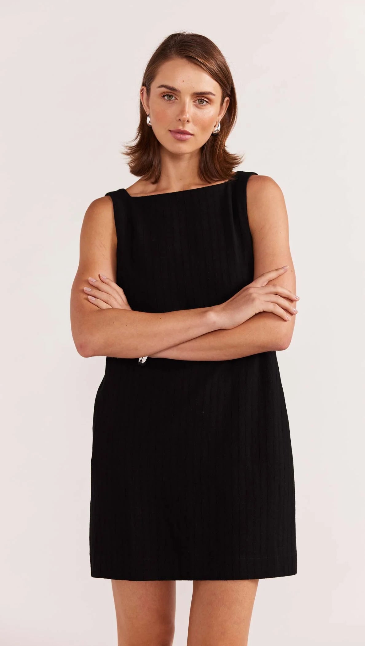 Introducing the STAPLE THE LABEL EMBER MINI DRESS in black. This versatile mini dress is a must-have for any wardrobe, perfect for work, parties, or play. With a high square neckline, deep V back, and side seam pockets, it's both stylish and functional. Designed in Sydney, Australia for ultimate style.