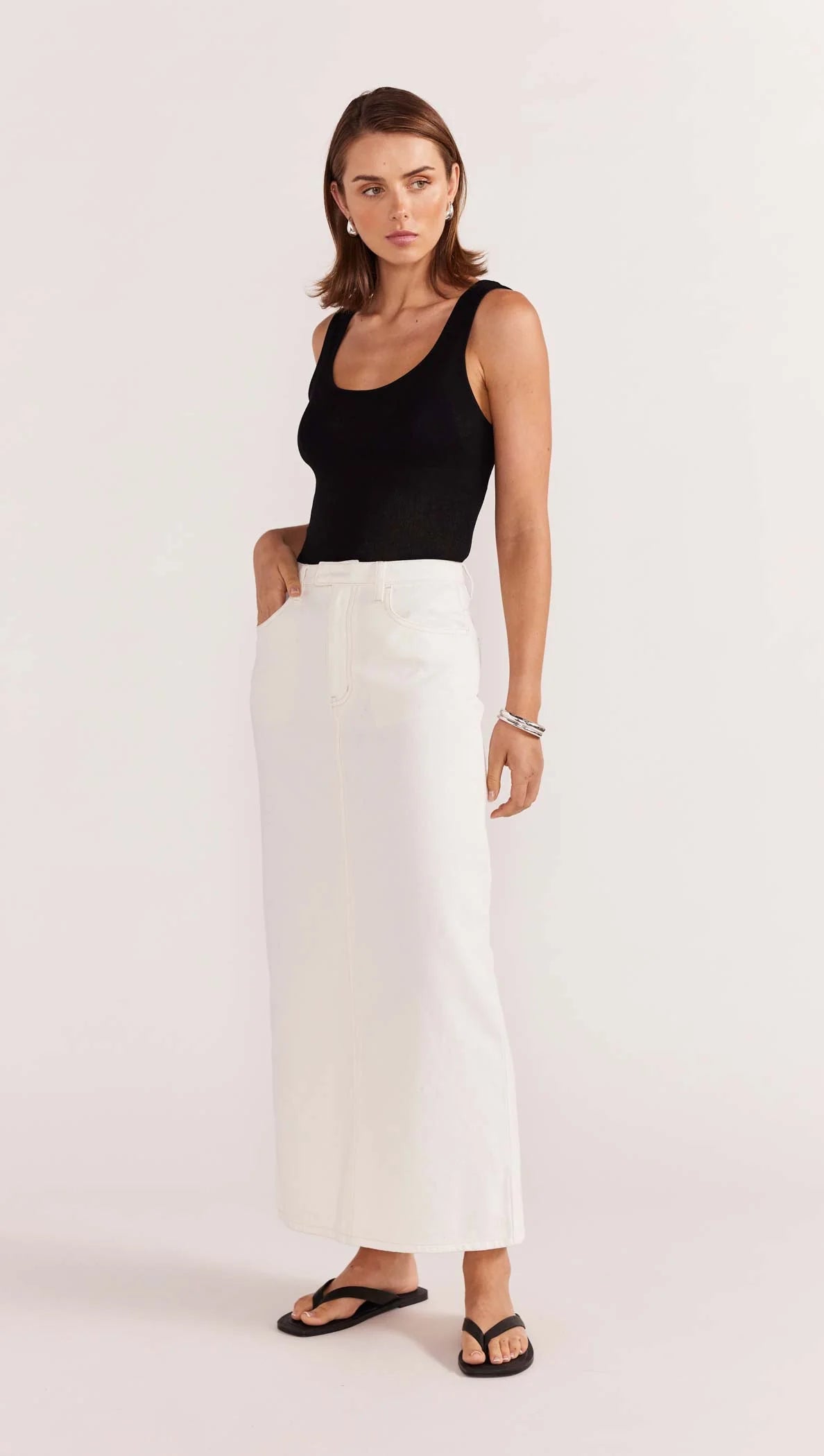The STAPLE THE LABEL INNES DENIM MIDI SKIRT WHITE is a versatile and essential piece for any wardrobe. Featuring a midi length, centre front panelling, and a zip and button closure, it can be easily styled with a basic tee and sandals for a casual weekend look. Its versatile design allows for high waist or low rise wearing, making it the perfect addition to your collection. Made with contrast topstitching and designed in Sydney, Australia.