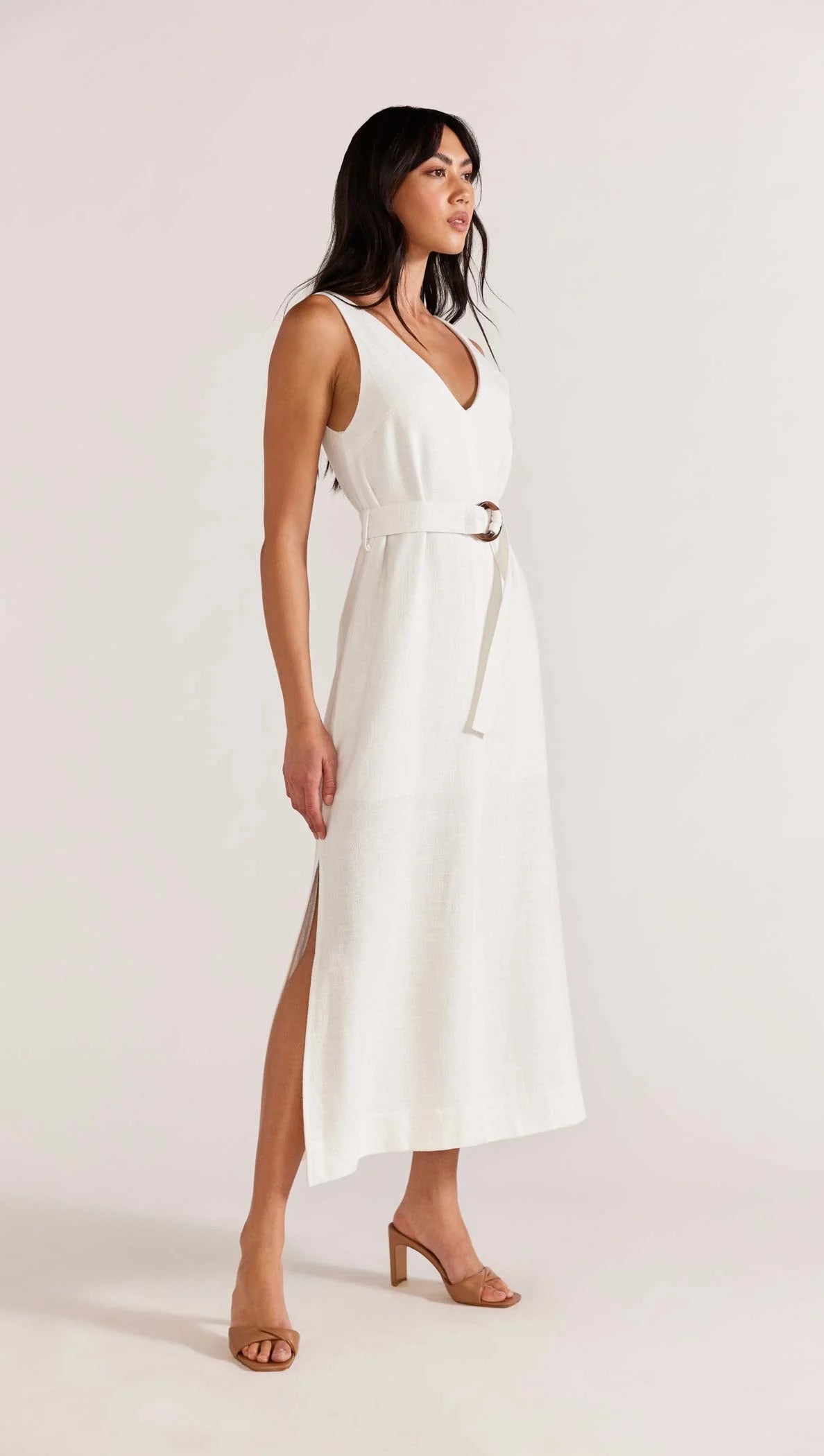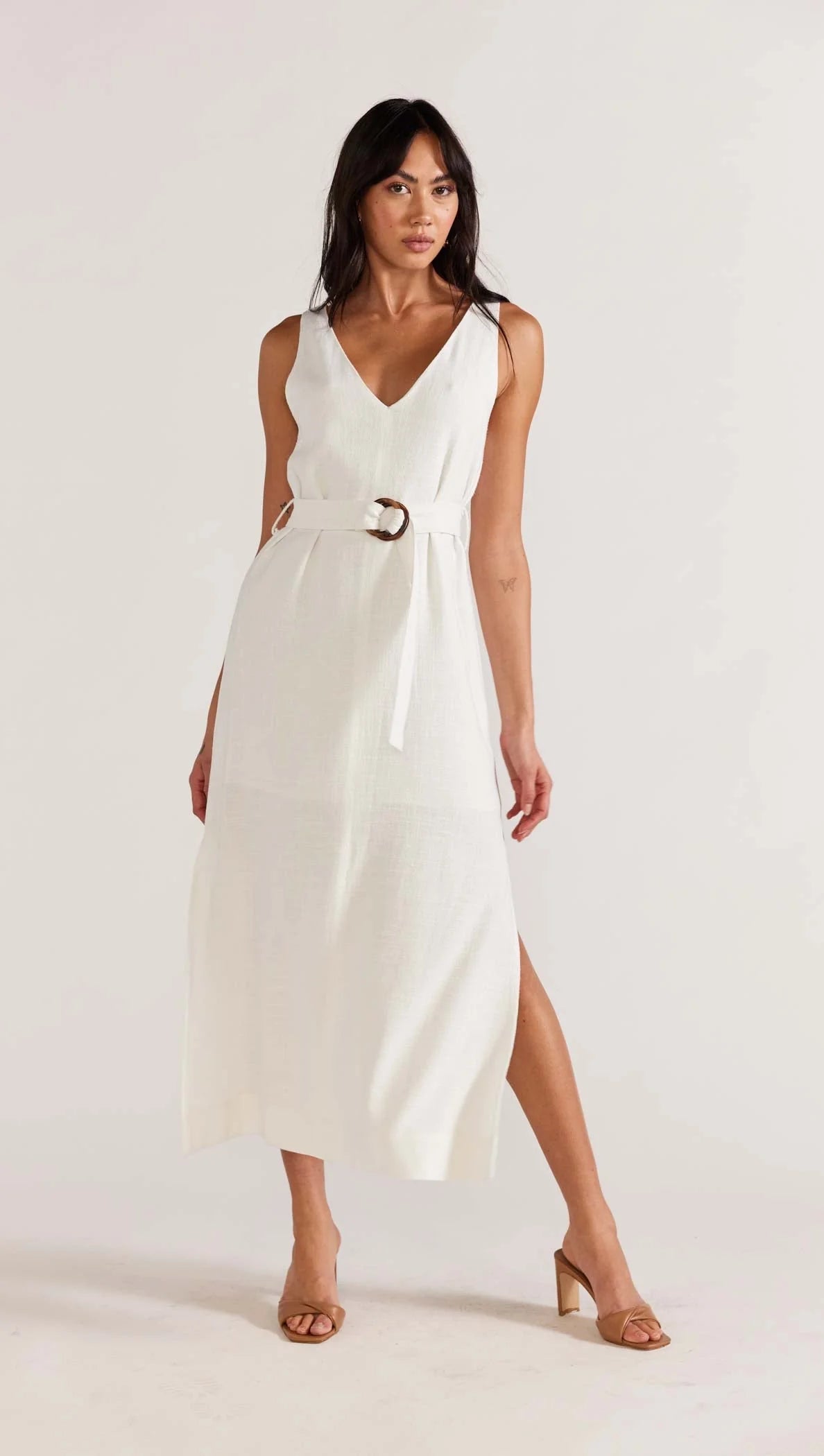 The STAPLE THE LABEL OLINA BELTED MIDI DRESS WHITE is the perfect piece for your summer wardrobe. This linen blend dress features a deep V neckline, a removable self-tie belt and a side split in the hem for a flattering silhouette. The invisible zipper entry in back and tortoise shell O-ring buckle add a touch of modern sophistication to the classic design. Crafted and designed in Sydney, Australia.