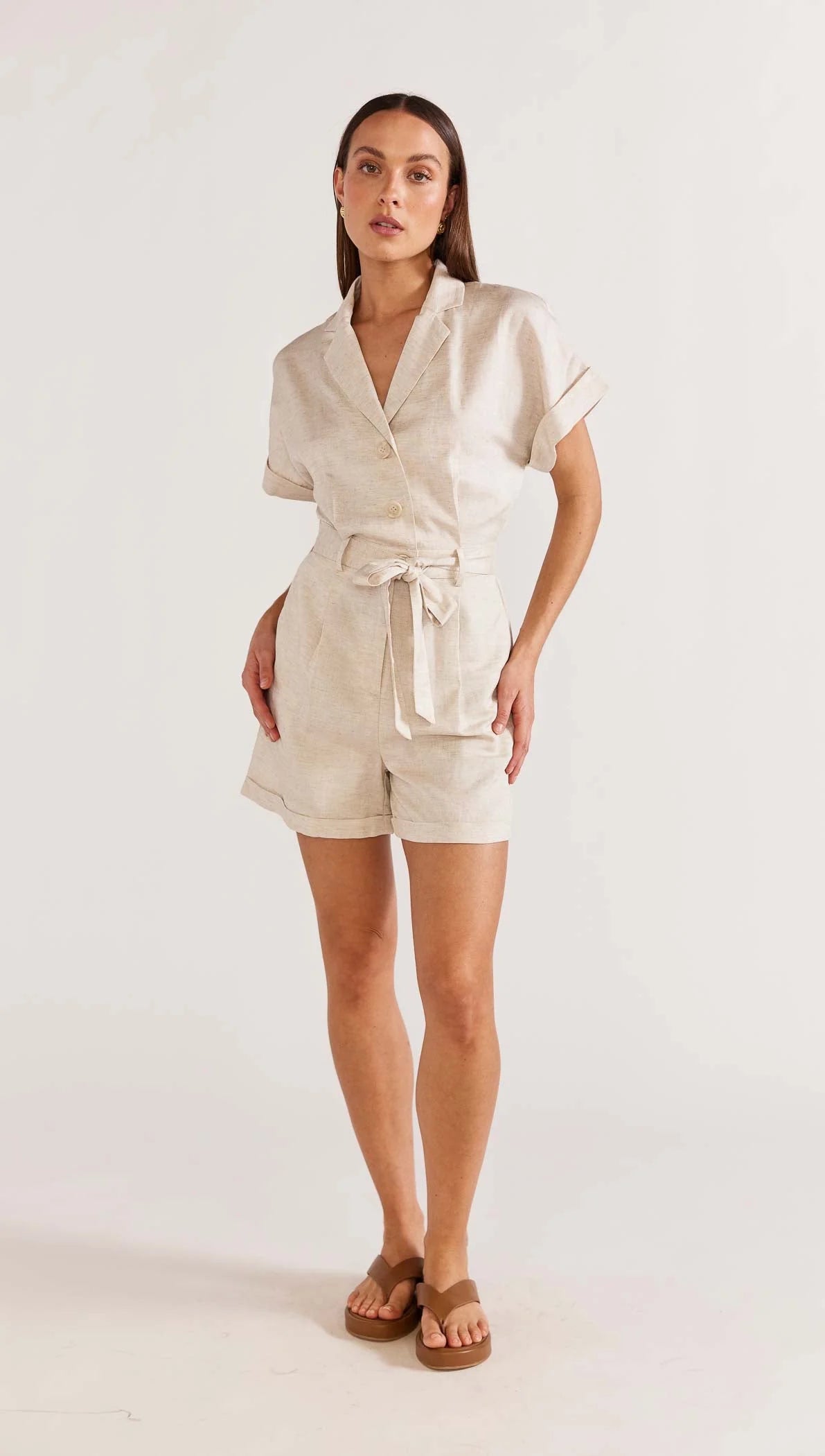 Discover comfort and style with the STAPLE THE LABEL VANCE PLAYSUIT NATURAL MARLE. Crafted from a luxurious linen blend, this playsuit features a notched collar, V-neck opening, and button-through closure for a chic look. The elasticated waist and removable waist tie provide a flattering fit, making it perfect for any occasion. Designed in Sydney, Australia.
