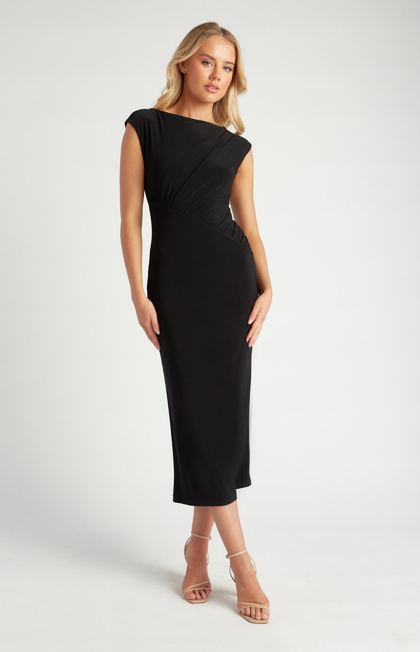 Discover ultimate comfort and style with our STYLE STATE GATHERED BODICE SEAM DETAIL JERSEY MIDI DRESS. Made with dressy jersey fabric and stretch jersey, this dress offers a flattering fit and elegant silhouette. The ruched detail at the shoulder and side seams, along with the asymmetric gathered feature at the bodice, adds a touch of sophistication. Designed with a boat neckline and a side invisible zip, this fitted dress is perfect for any semi-formal occasion. Fully lined for ultimate comfort. Material: Main - 92% Polyester, 8% Spandex, Lining - 95% Polyester, 5% Spandex.