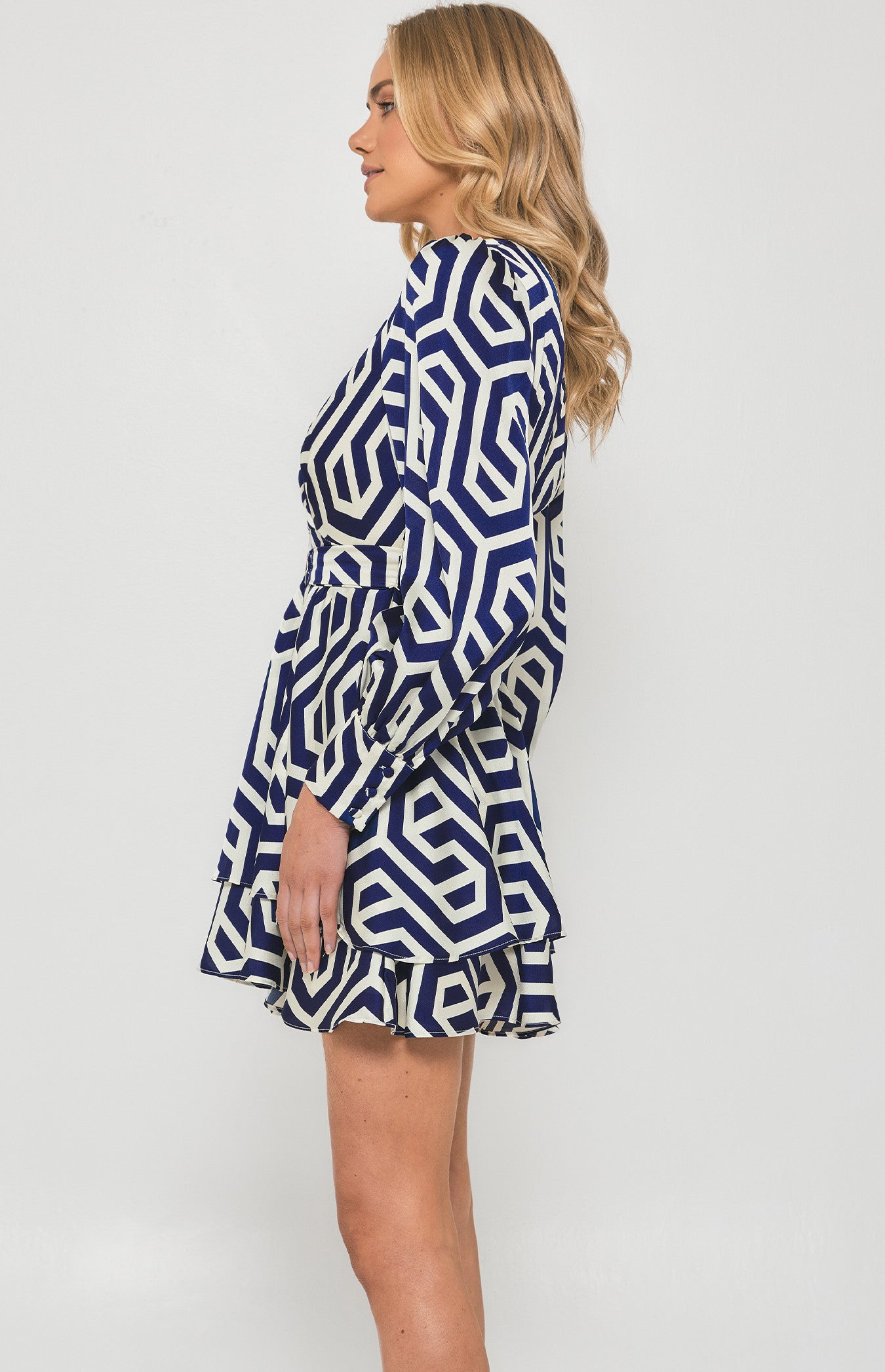 Elevate your style game with our STYLE STATE Geometric Print Dress. The V cross front neckline and bust pleats shape your silhouette, while long cuffed sleeves and a tiered hem add a touch of elegance. The removable belt with metal buckle detail cinches your waist, and the centre back invisible zip ensures a seamless look. Made from 100% polyester, with a spare button provided. Model is wearing size 8 (height: 178cm).