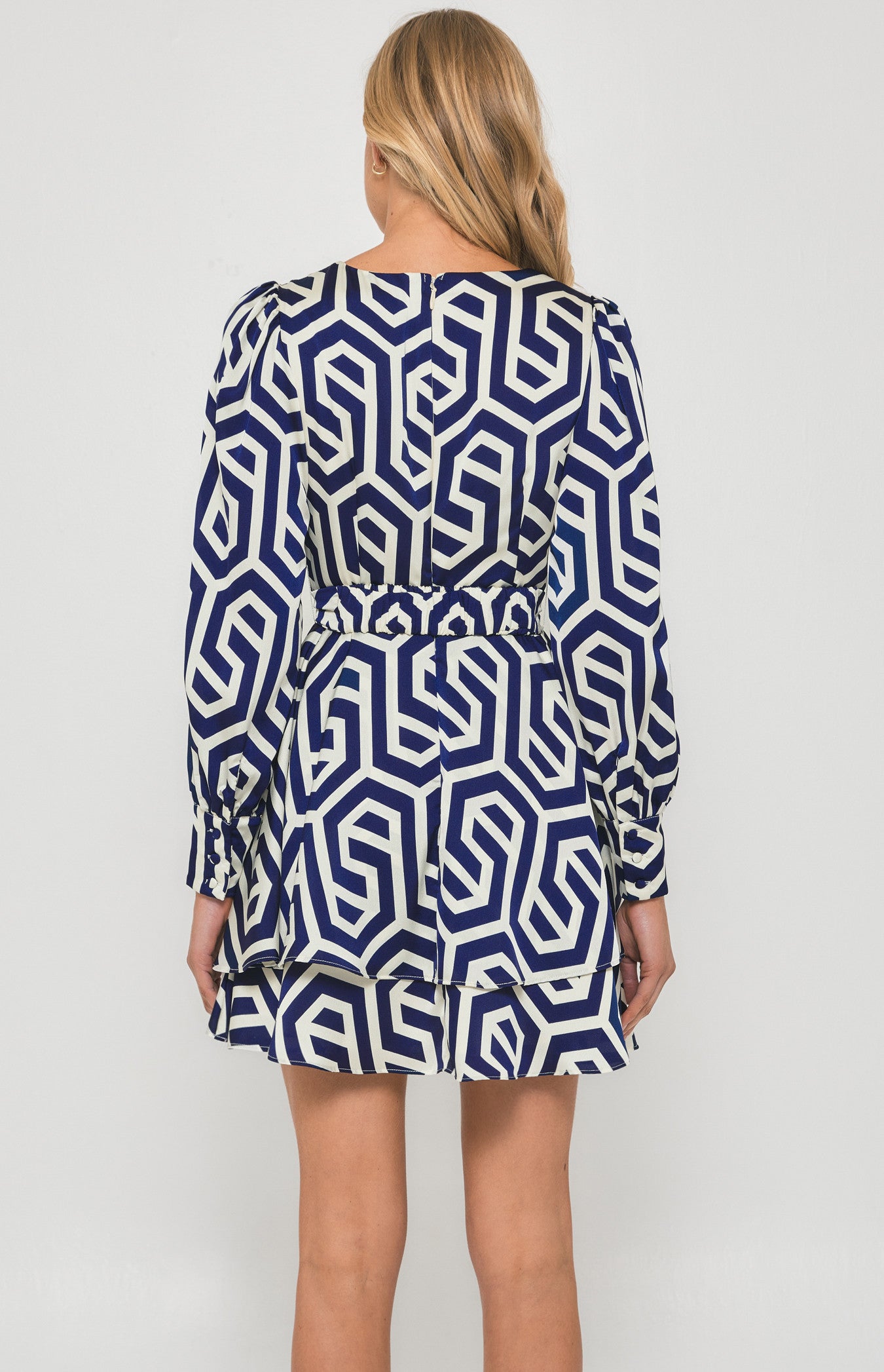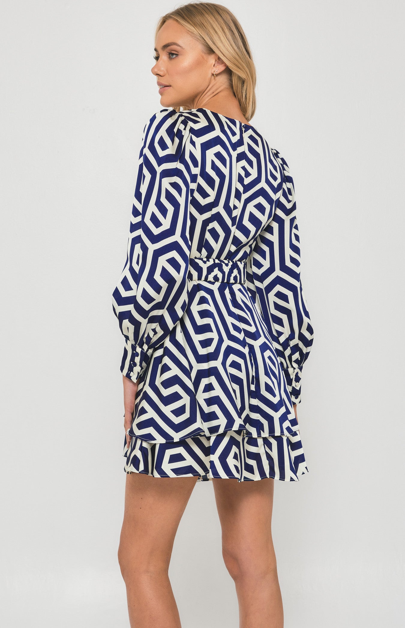 STYLE STATE GEOMETRIC PRINT DRESS WITH METAL BUCKLE DETAIL BLUE