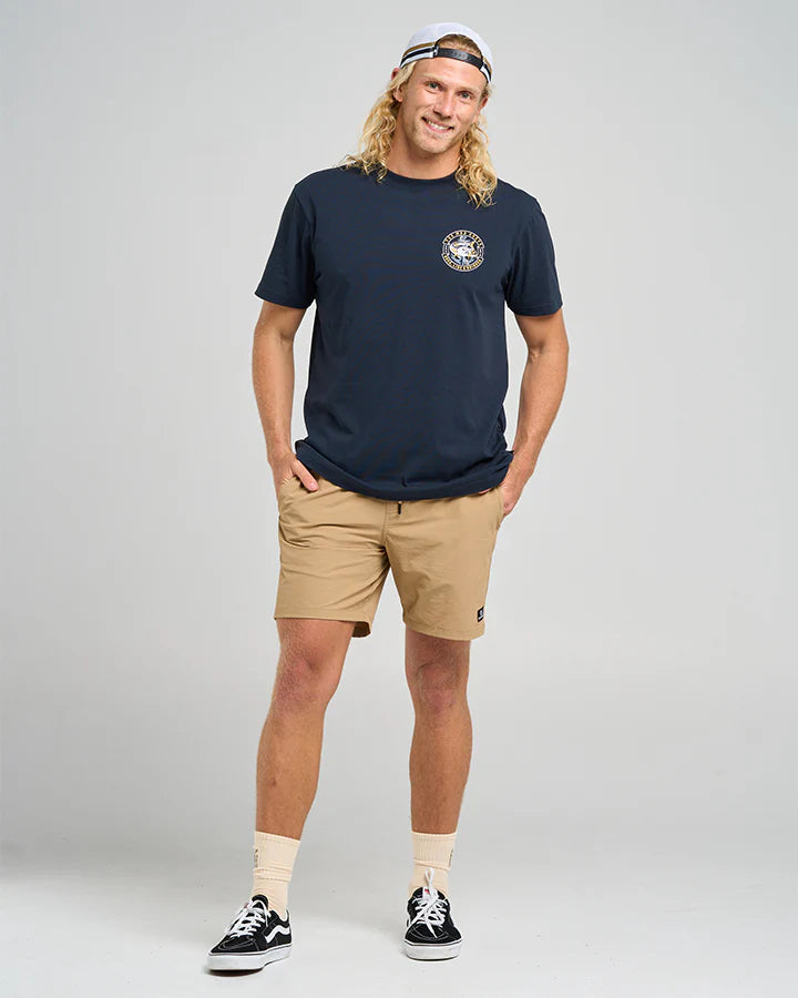The Mad Hueys Hooked Cuda SS Tee in navy is crafted from 100% cotton jersey for soft, breathable comfort. It features front chest and back graphic prints, a ribbed neckband, and a woven label on the sideseam. Designed with a men's regular fit, this tee offers true-to-size comfort for everyday wear.