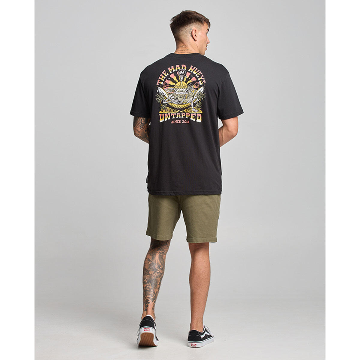 Get ready to tap into the wild world of The Mad Hueys with our Untapped SS Tee in sleek black. Made with 100% cotton jersey for comfort and style, this tee features a ribbed crew neckline, screen print design, and woven label. With a regular fit and modeled by Natal at 6'1, it's perfect for all your adventures.