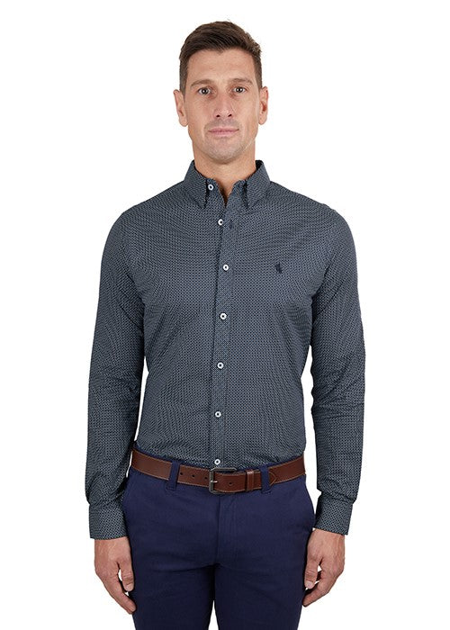 This THOMAS COOK MENS CADE TAILORED LONG SLEEVE SHIRT NAVY/BLUE is expertly crafted with a tailored fit and stretch fabric for comfort and movement. The small scale geometric print adds a touch of style, while the contrast chambray details and internal neck stripe taping elevate the look. Complete with removable collar stays and a subtle horseman embroidery, this shirt is perfect for any occasion.