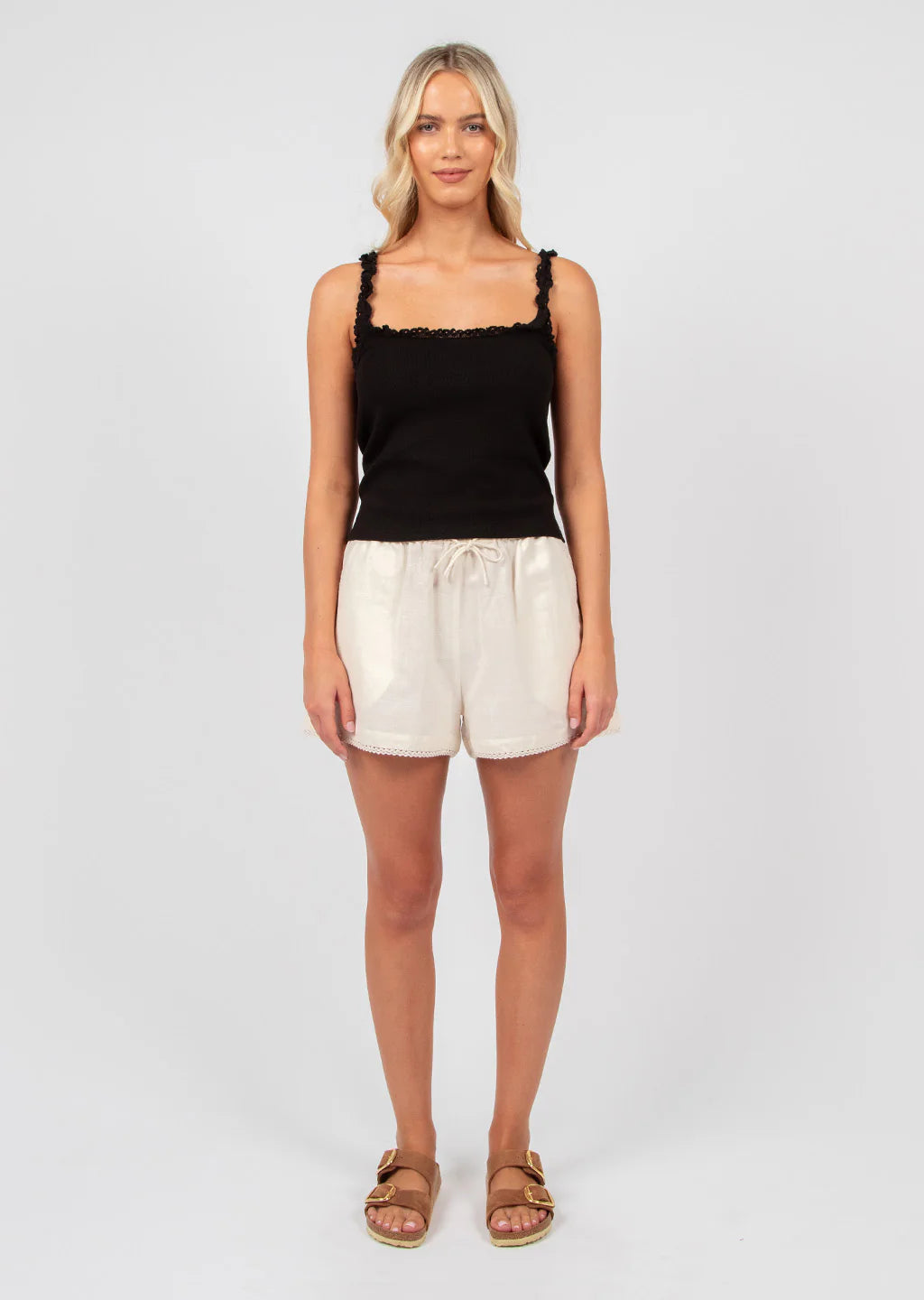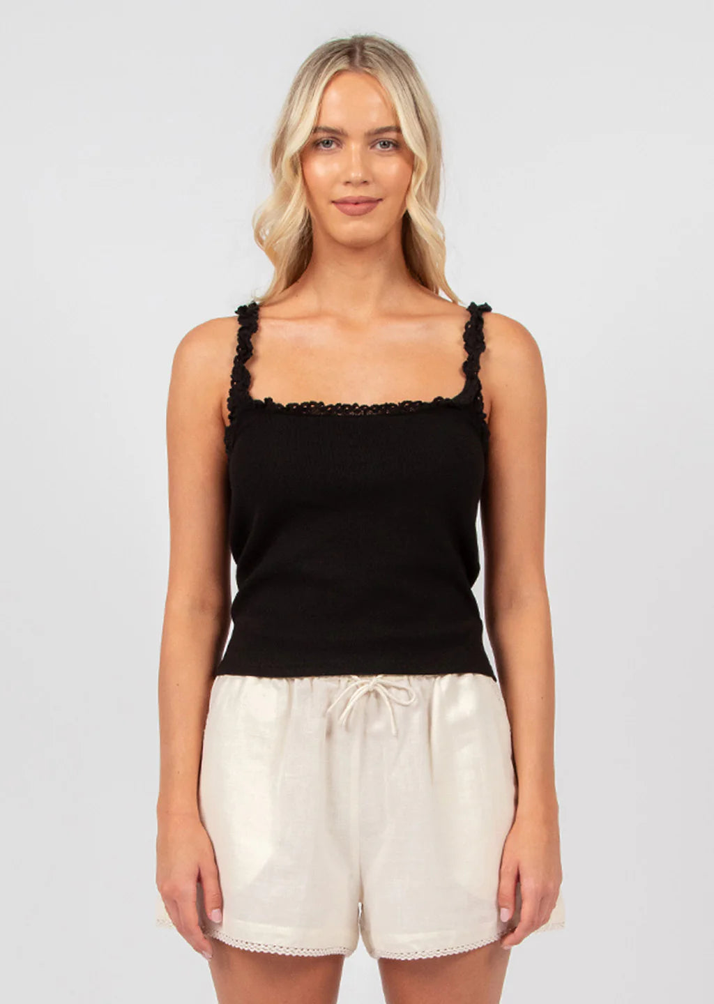 Introducing the Titchie Amore Tank in black. Made from certified organic materials, this tank is not only stylish but also environmentally sustainable. The frill detail on the shoulder straps and twin needle stitching add a special touch to this super soft and versatile tank. Perfect for layering or wearing on its own.