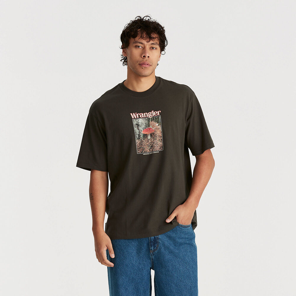 This Wrangler Amanita Slacker Tee features a recycled cotton blend with a soft hand feel. Designed to sit off the shoulder and relaxed in the body, it's our baggiest silhouette that drapes when worn. Featuring a stylish centre chest print, this tee is perfect for a casual and comfortable look. Model is 185cm tall and wearing a size M.