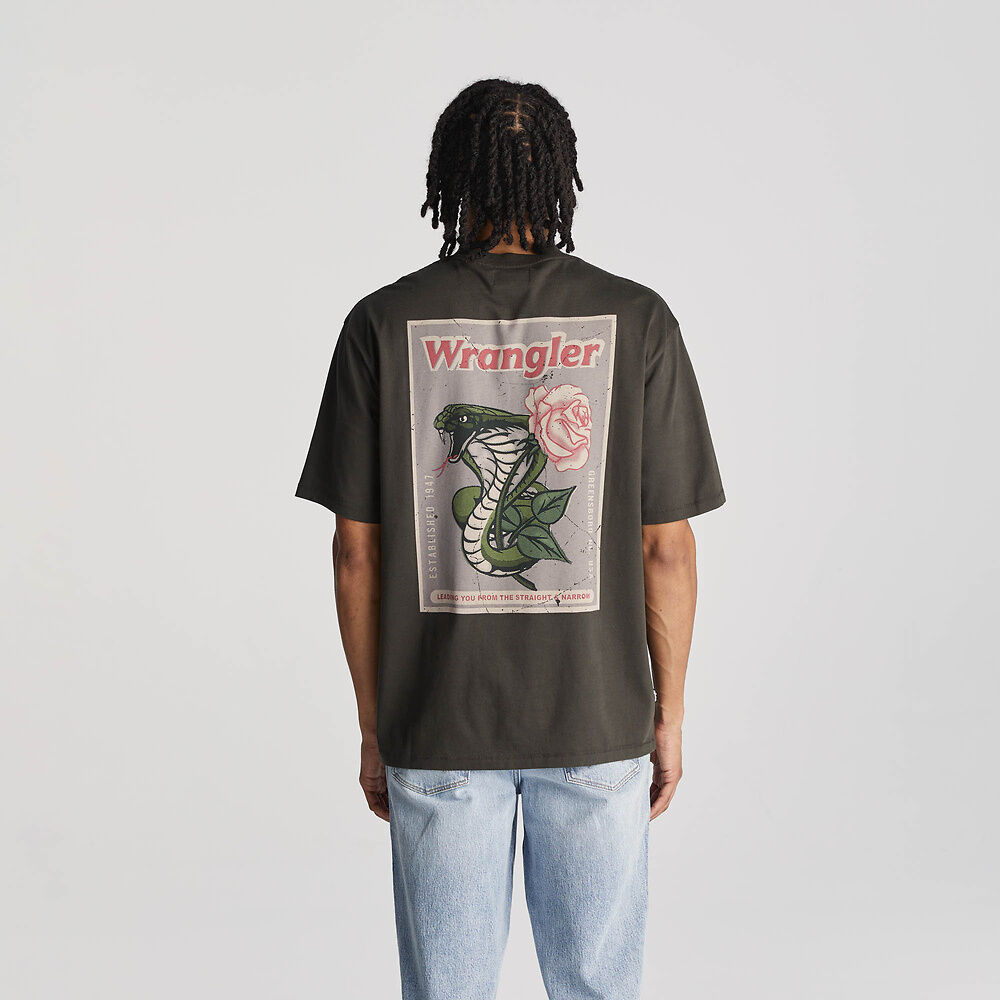 The WRANGLER COBRA SLACKER TEE DARK SLATE has a loose and baggy fit with a vintage-inspired graphic of a Cobra Snake. Made with recycled cotton, it offers a qualitative hand feel and a heavyweight material. Perfect for casual and comfortable wear.