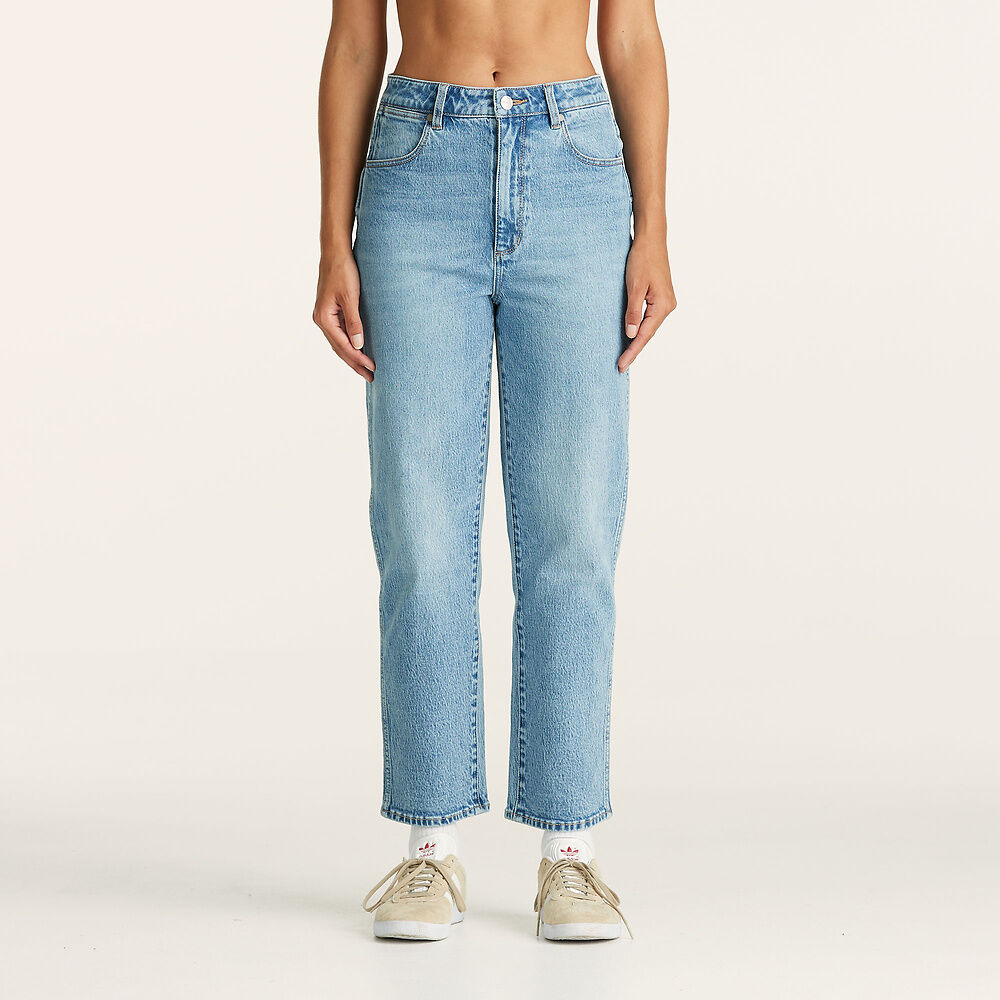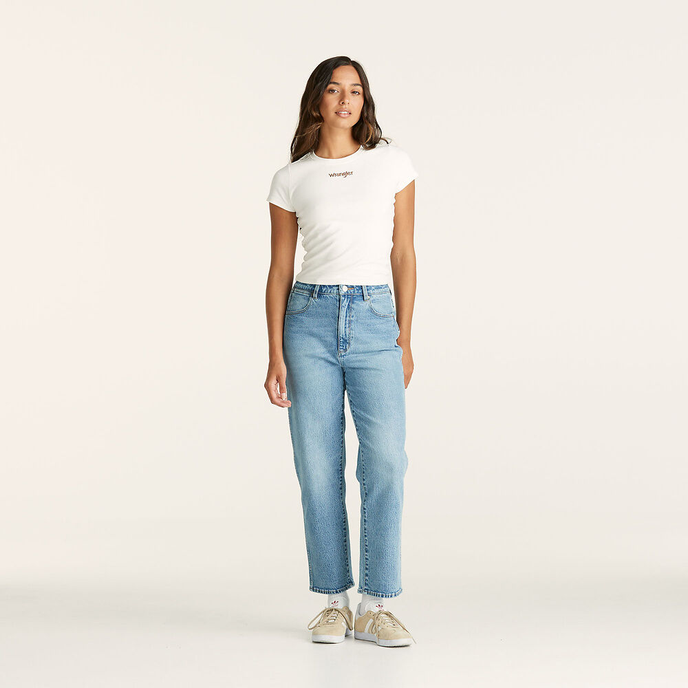 Introducing the Claudia Crop jeans by WRANGLER in Pennydale Blue. These straight leg jeans feature a super high-waist and are slightly cropped for a modern look. Made from comfort stretch denim with a zip fly, they offer a vintage-inspired fit with a classic washed blue color and heritage stitching. Perfect for any occasion.