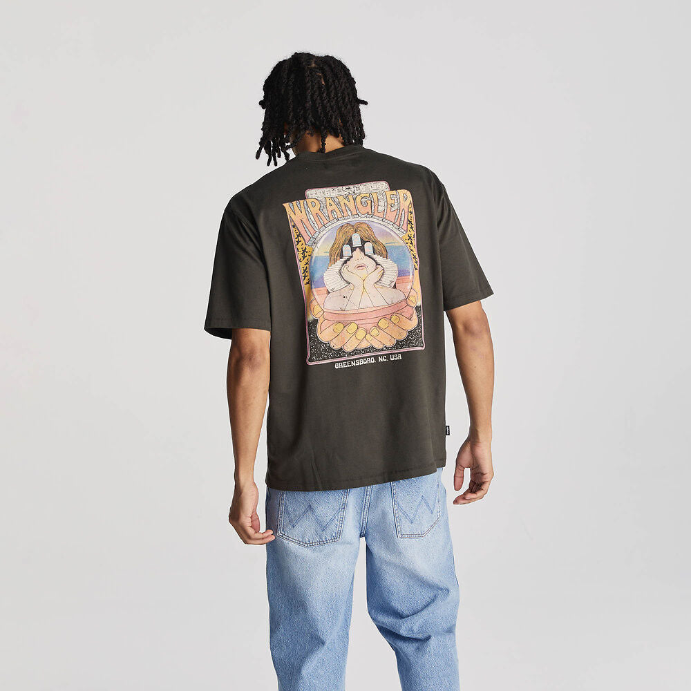 As an industry expert, the Wrangler Looking Glass Slacker Tee boasts a loose fit and is made from heavy-weight, recycled cotton for a qualitatively soft hand feel. The hand-drawn, vintage-inspired graphic of a woman in a crystal ball adds a unique touch. Model is 186cm tall and wears a size M.