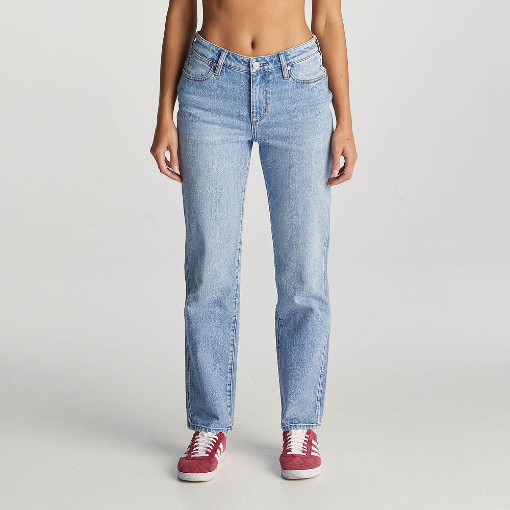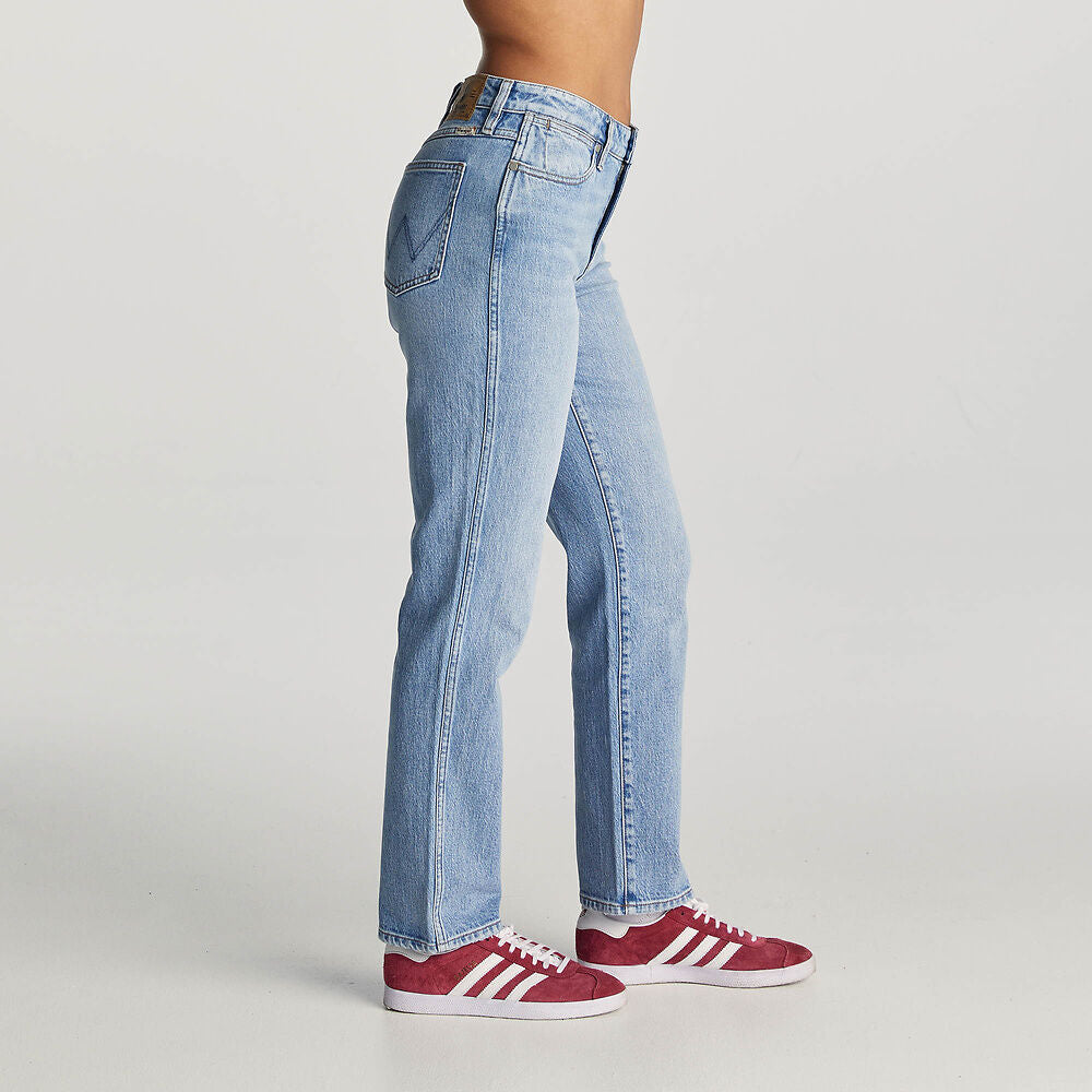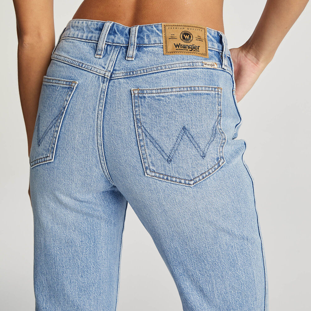 Introducing our WRANGLER MID TORI SLIM STRAIGHT DIAMOND SKIES jeans. Made with organic cotton and featuring a flattering mid-rise and slim straight fit, these jeans are designed for comfort and style. With water-saving technology and a vintage indigo wash, you'll love the leg-lengthening effect and contrast stitching on these versatile, petite-sizing jeans.