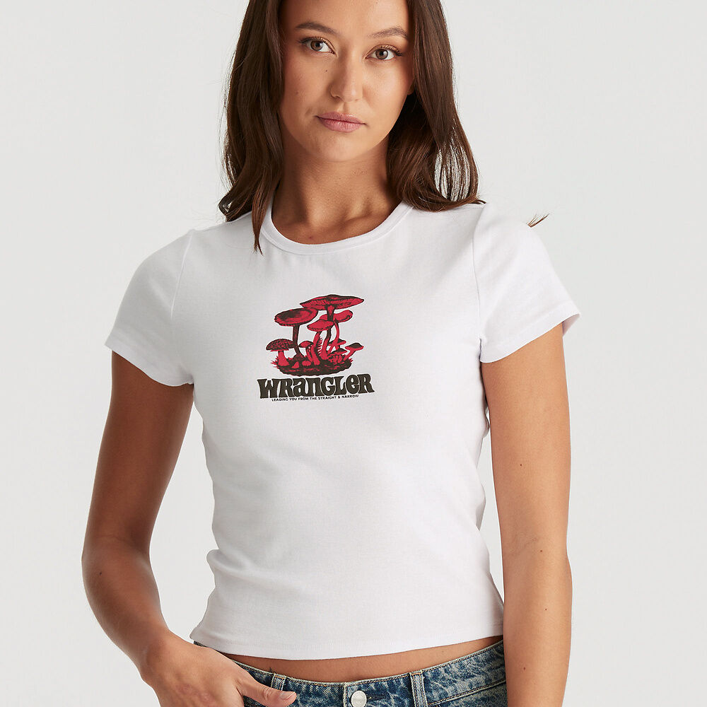 Elevate your wardrobe with our WRANGLER SHROOM STAPLE RIB TEE in OPTIC WHITE. This form-fitting silhouette features a flattering neckline and weighty rib fabric that hugs your figure. Made with recycled cotton blend for an eco-friendly option. Pair it with your favorite jeans for a stylish and sustainable look. Model is 171cm and wearing size 8.