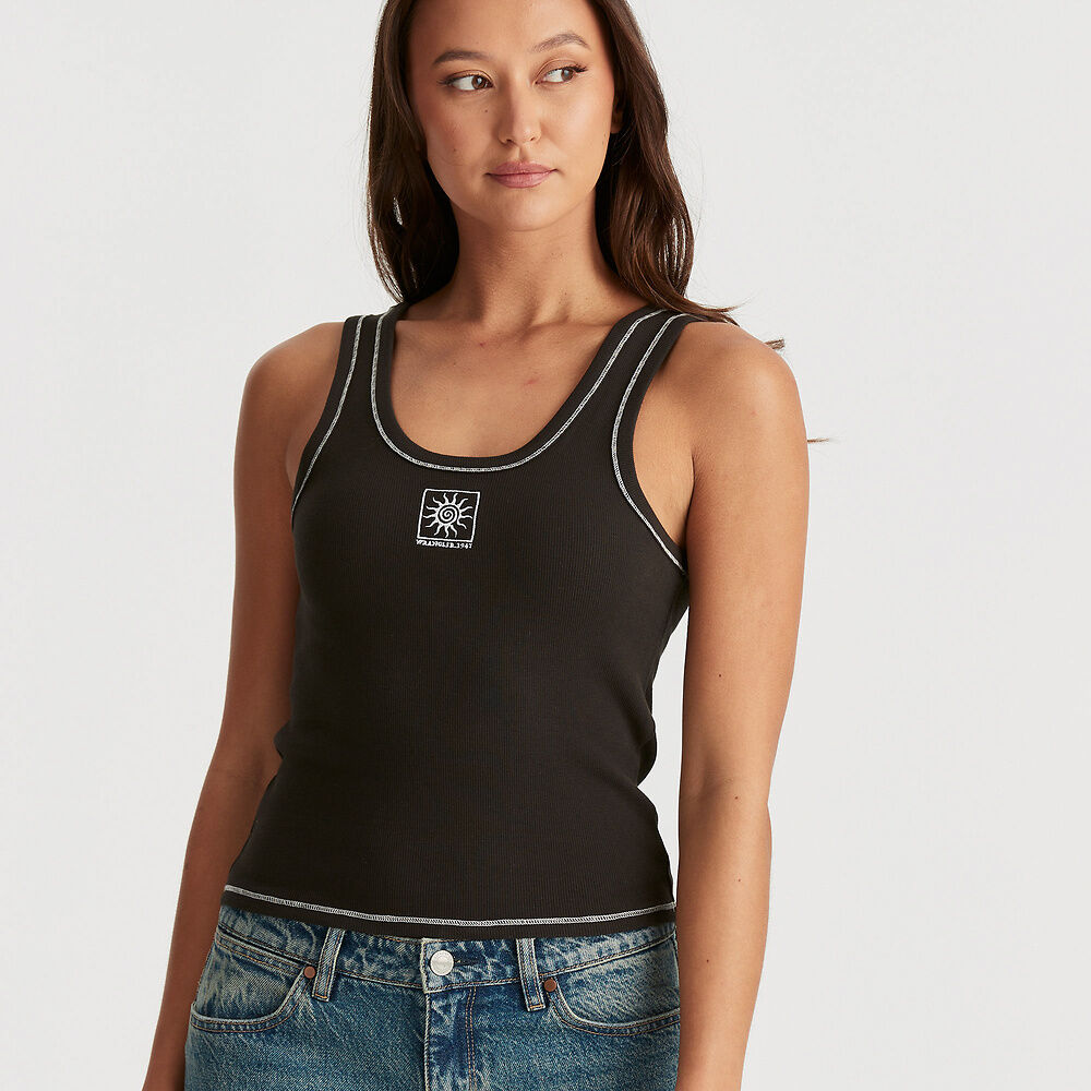 Slip into the throwback vibes of the 90's with our Sun Spiral My Mates Tank. Made from a heavy weight stretch cotton rib, it boasts a low scoop neckline and thicker straps for a comfy fit. Plus, with recycled cotton blend and playful front chest embroidery, it's a win-win for you and the planet. Model is 171cm and wears a size 8.