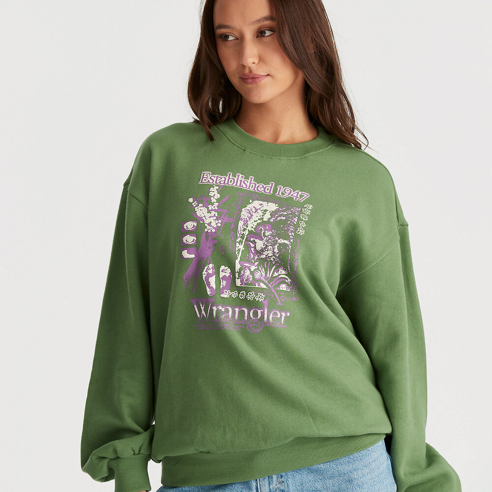 Achieve the ultimate vintage sports look with our WRANGLER WATTLE SLOUCH SWEAT. Designed with an oversized, slouchy fit, this sweatshirt features a crew neckline, ribbed cuffs and hem, and drop shoulders. Made from a super soft, heavy weight fleece, you'll feel comfortable and stylish wearing it with your favorite Wrangler denim. Plus, it's made from a recycled cotton blend, making it an eco-friendly choice. Model is 171cm and wears a size 8.