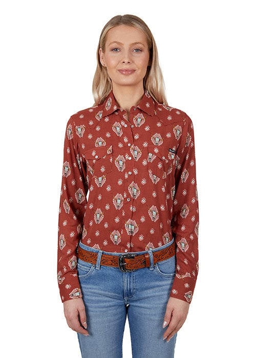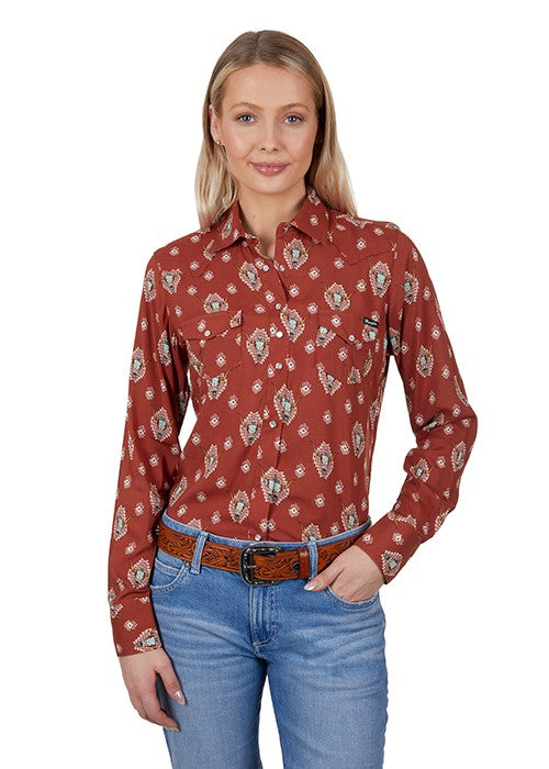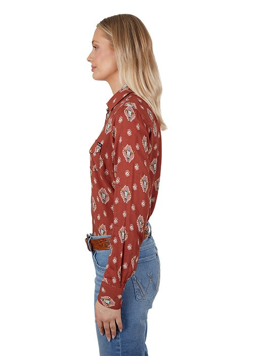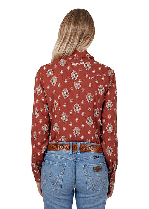 This WRANGLER WOMENS OLIVIA LONG SLEEVE SHIRT RUST is a classic western shirt featuring a unique steerhead and Aztec print. With a pearl snap closure and western chest pockets, it also boasts western front and back yokes and a Wrangler logo pip on the side seam. The soft handfeel and drape provide both comfort and style.